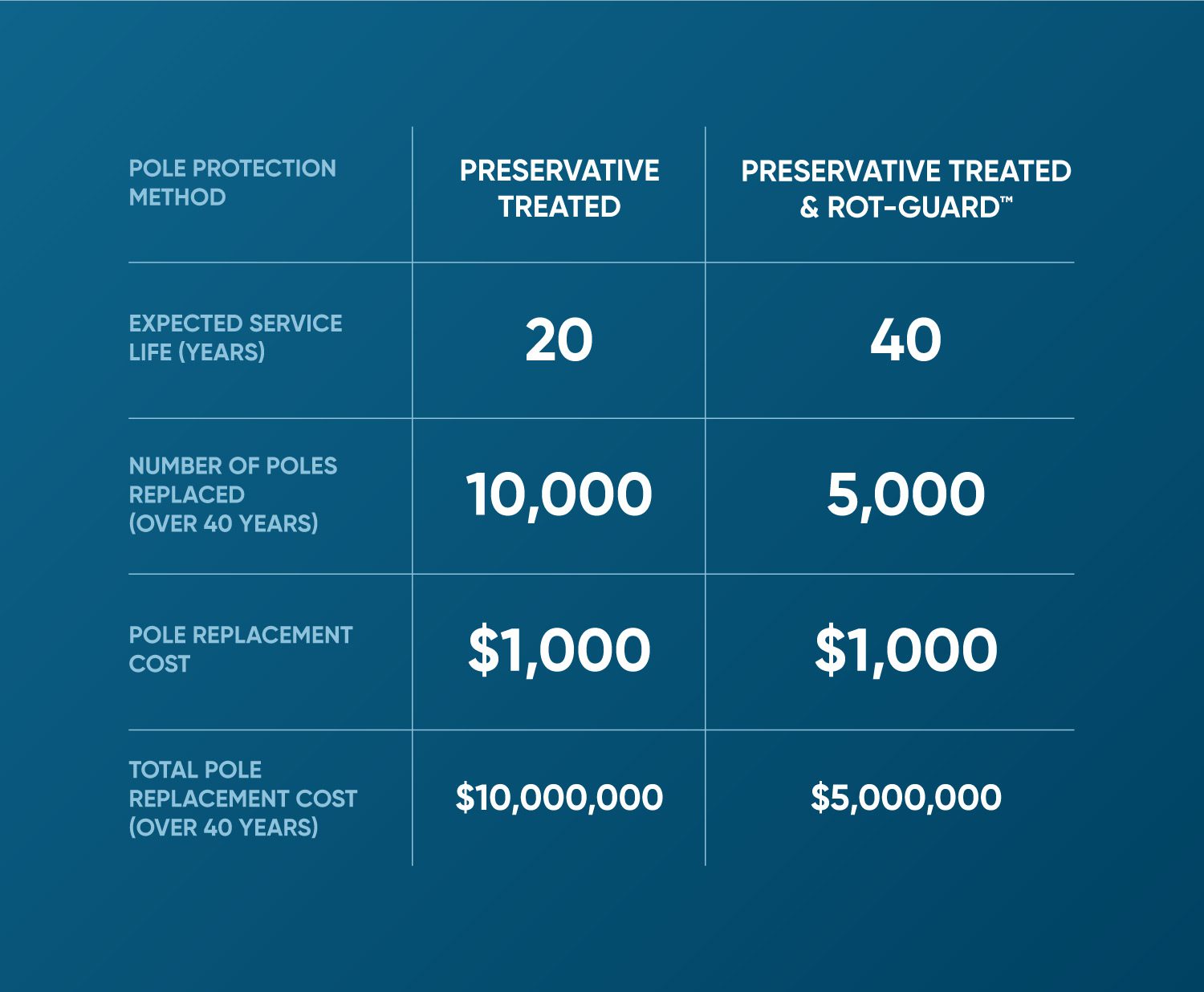 Rot-Guard™ sleeves make conventional ground-line decay impossible, with independent testing proving they add 20 years to the life of a pole from the start.
