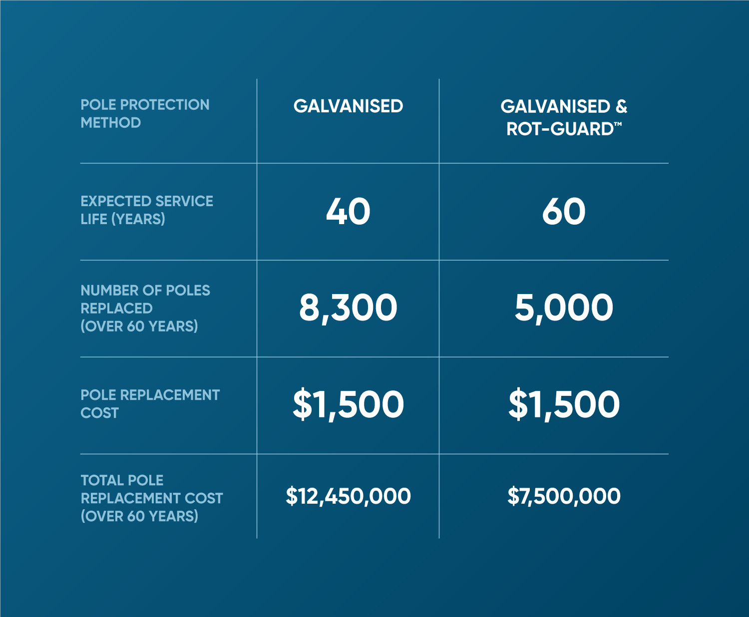Rot-Guard™ Sleeves are competitively priced and offer substantial cost savings through maximising the life of the pole, reducing the requirement for inspections, pole remediation and replacement.